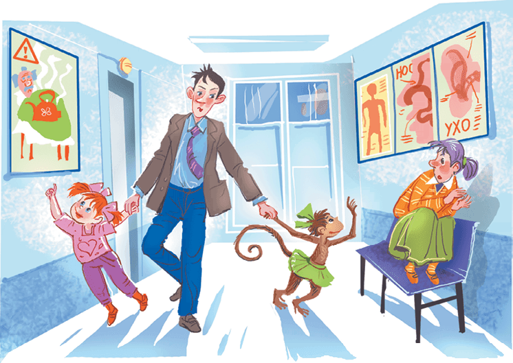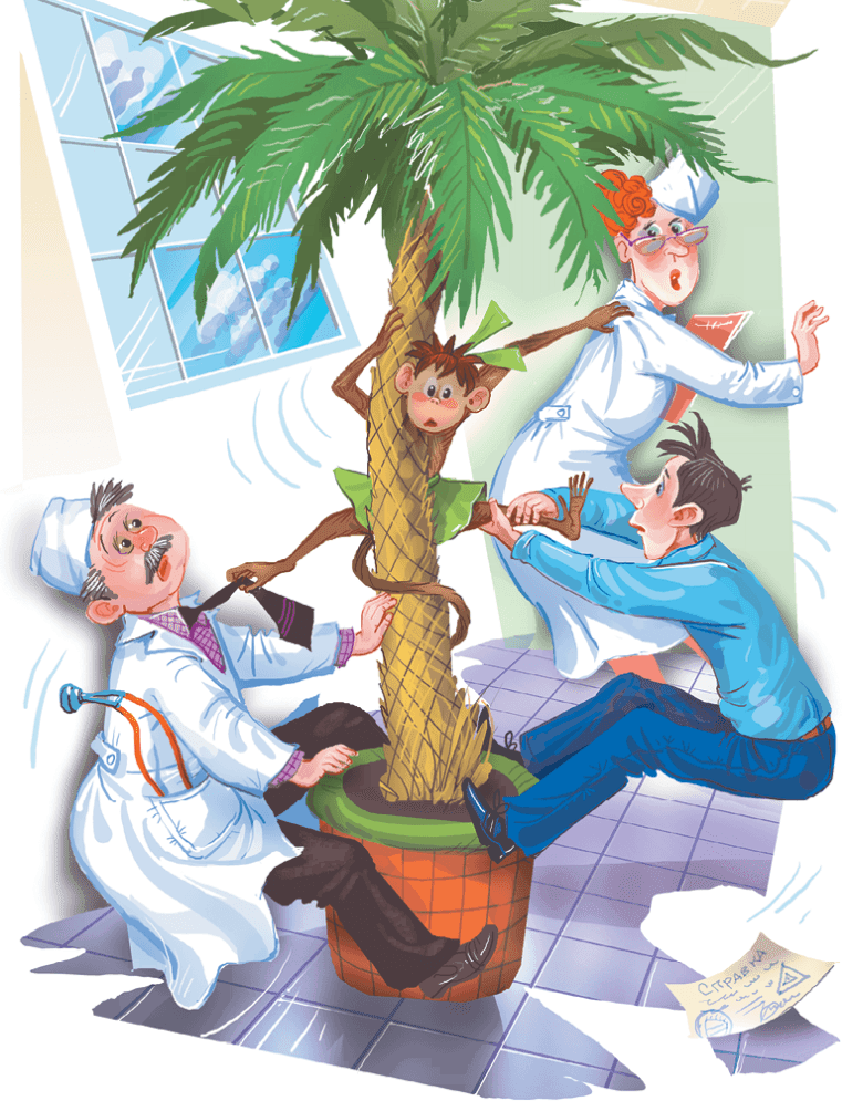 Но обезьянка дерево не отпускала. Врач попытался её отцепить – и сам прилип. Папа ещё строже говорит: