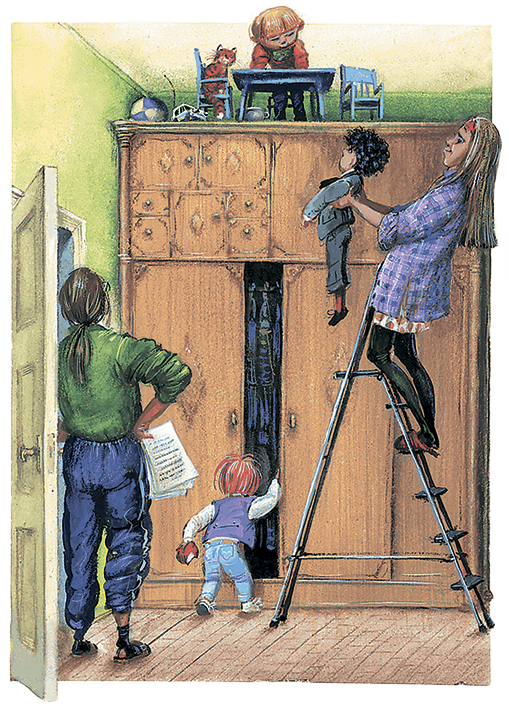 Яша подвинул к шкафу обеденный стол и влез на него. Но до крыши шкафа не достал.
