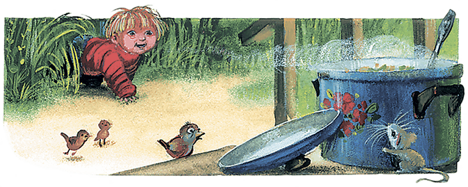 – Я думаю, нашего Яшу куда-нибудь ветром откатило. Давай, мама, мы кастрюлю с супом вынесем на крыльцо. Ветер подует и запах супа к Яше принесёт. На этот вкусный запах он и приползёт.