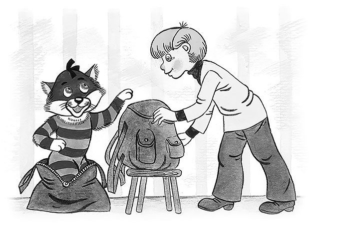 Он с вечера сложил в рюкзак всё, что надо. И ножик перочинный, и куртку тёплую, и фонарик. Взял все деньги, которые на аквариум копил. И приготовил сумку для кота. Кот как раз в этой сумке помещался, только усы наружу торчали. И лёг спать.