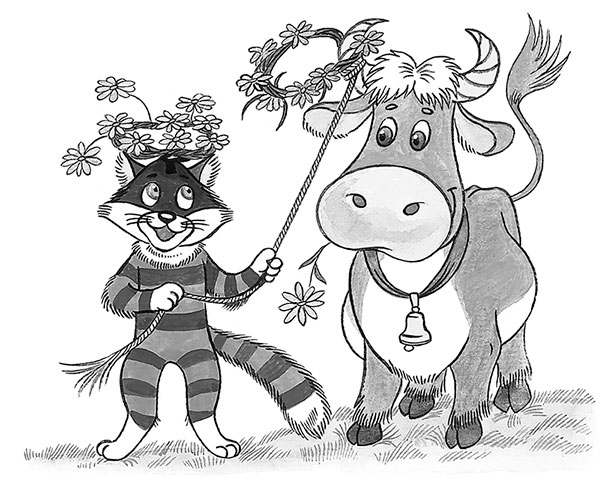 А через некоторое время домой Матроскин является и корову на верёвочке ведёт. Он её напрокат взял в сельском бюро обслуживания. Ну просто профессор с рогами! Только очков не хватает. И кот тоже заважничал.
