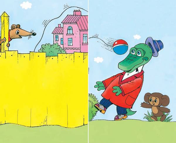 Однажды Чебурашка и Гена гуляли. Вдруг из-за забора вылетел мячик на резиночке, стукнул Чебурашку по голове и улетел обратно.