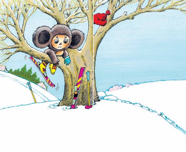 Чебурашка со своими лыжами садился Гене на хвост, и теперь они весело неслись вниз вдвоём. Даже с самой крутой горы. И Чебурашке уже не надо было сушиться.