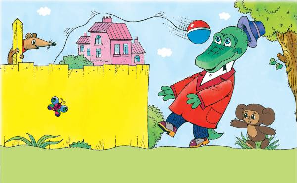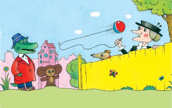 Однажды Чебурашка и Гена гуляли. Вдруг из-за забора вылетел мячик на резиночке, стукнул Чебурашку по голове и улетел обратно.