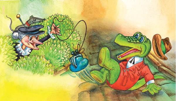 Она снова подбросила крокодилу кошелёк. Сердитый Гена так шаркнул ногой, что Шапокляк сама вылетела из кустов!
