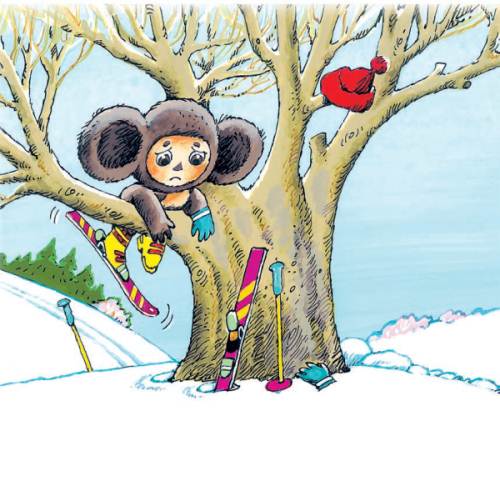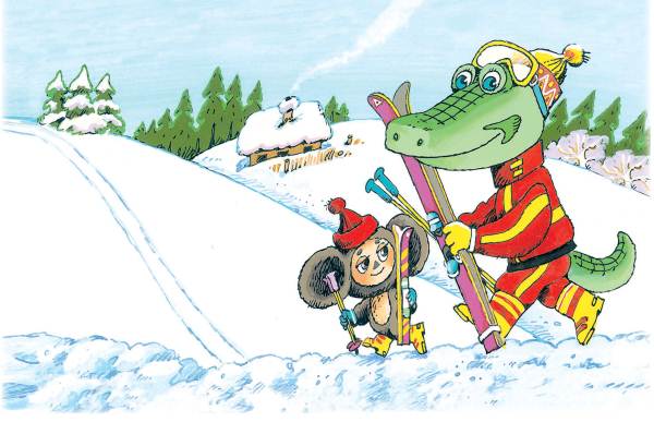 И правда – он всё здорово придумал! Чебурашка со своими лыжами садился Гене на хвост, и теперь они весело неслись вниз вдвоём. Даже с самой крутой горы. И Чебурашке уже не надо было сушиться.