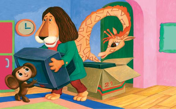 Когда Чебурашка получил новую квартиру, детский сад подарил ему мебель. А потом стали приходить друзья и дарить подарки. Пришёл лев Чандр и принёс телевизор.