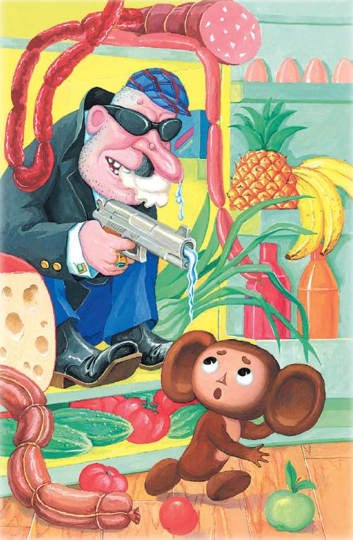 Полезет Чебурашка в холодильник – там представитель белой мафии сидит. Весь он в инее, во рту у него пельмень, а из пистолета сосулька высовывается.
