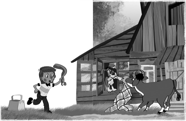 А они молчат. Только на него глаза таращат. Тут он увидел, что все цветы на окне поедены и занавесок нет, и всё понял. Вынул он ремень из брюк да как хлестнёт глупую корову! А корова, видно, балованная была. Она на дядю Фёдора с рогами. Он – бежать. Но брюки у него без ремня были, он в них и запутался. Вот-вот корова бодать начнёт.