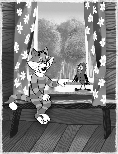 Шарик с котом согласился и тоже стал учить галчонка «ктотаму». Целую неделю учили его, и наконец галчонок выучился. Только кто-нибудь в дверь постучит или на крыльце затопает, Хватайка сразу спрашивает: