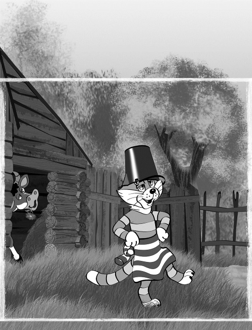 А корова как разбежится – и в стенку головой трах! Еле-еле её в сарай загнать удалось. Пошёл Матроскин её доить. Через пять минут выходит, а с ним что-то странное сделалось. Матроска у него спереди как фартук надета, а подойник на голове как каска. И поёт он что-то несуразное:
