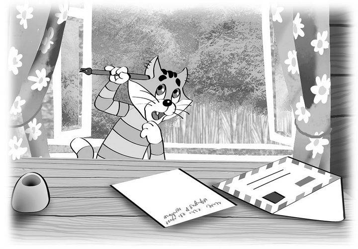 Но тут дядя Фёдор увидел, что деревенские ребята змея в поле запускают. И дядя Фёдор к ним побежал. А коту велел письмо дописывать за него. Кот взял карандаш и начал писать: