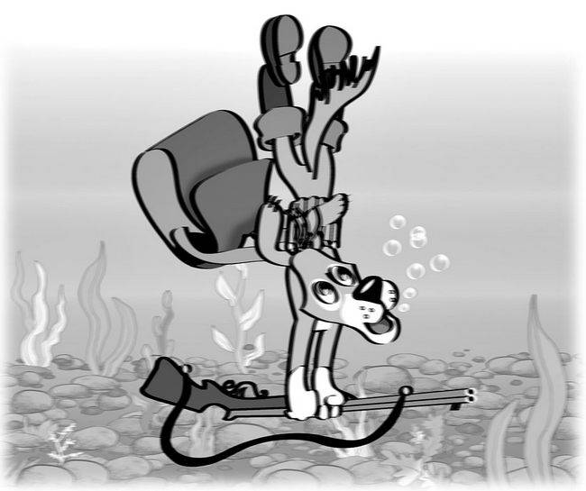 Вылез из сумки – и по следу. Ружьё за спиной, нос в землю. Добежал до узенькой речки, видит: заяц уже на том берегу скачет. Пёс ружьё в зубы и поплыл – не бросать же зайца! А ружьё тяжёлое – вот-вот утопит Шарика. Смотрит Шарик, а он уже на дне.