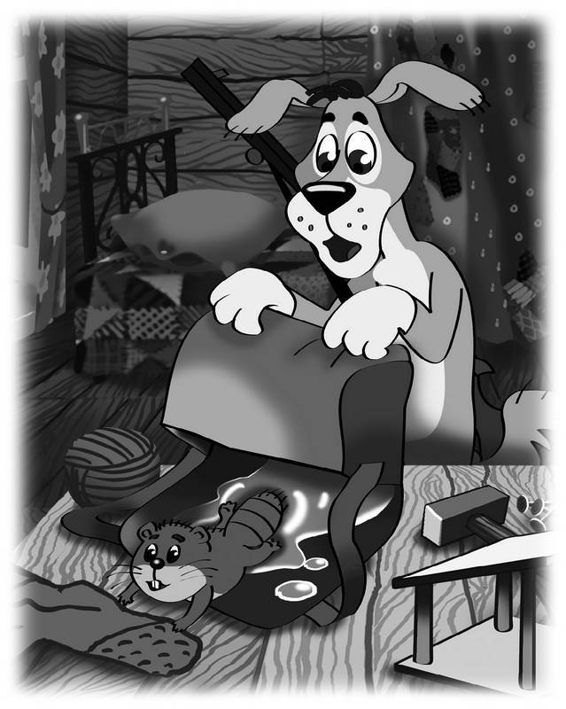 Тут кот услышал, что мыши в подполе заскреблись. Крикнул он Шарика и в подпол побежал с пылесосом. Шарик карандаш в зубы взял и стал дальше калякать: