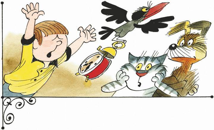 Дядя Фёдор его накормил и на шкаф посадил. И назвали галчонка Хватайкой: он что ни увидит, всё на шкаф тащит. Увидит спички – на шкаф. Увидит ложку – на шкаф. Даже будильник на шкаф перетащил. А взять у него ничего нельзя. Сразу Хватайка крылья в стороны, шипит и клюётся. У него на шкафу целый склад получился. Потом он немного подрос, поправился и стал в окно вылетать. Но к вечеру обязательно возвращался. И не с пустыми руками. То ключ от шкафа утащит, то зажигалку, то детскую формочку. Однажды даже соску принёс. Наверное, какой-нибудь малыш спал в коляске на улице, а Хватайка подлетел и соску вытащил.