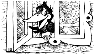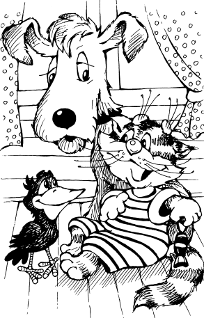 Шарик с котом согласился и тоже стал учить галчонка «ктотаму». Целую неделю учили его, и наконец галчонок выучился. Только кто-нибудь в дверь постучит или на крыльце затопает, Хватайка сразу спрашивает: