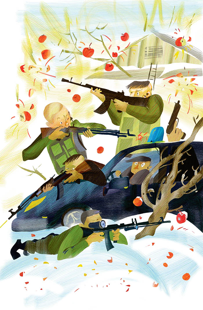 Другие охранники приняли их за гранаты и начали метко по ним стрелять. Яблоки прямо в воздухе разлетались в мелкие брызги красивым салютом.