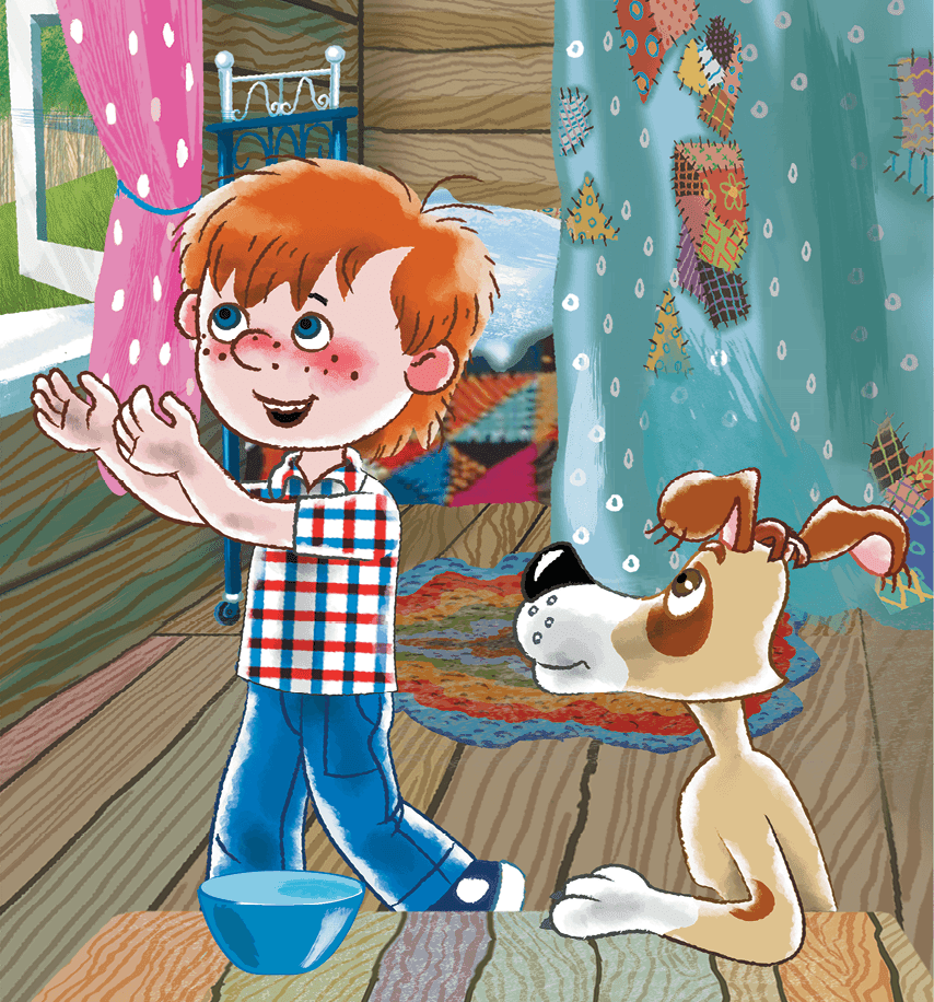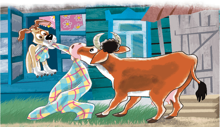 Достал он косу и пошёл сено на зиму запасать. А корова к окну подошла. На окне занавесочки были. Она взяла и все занавесочки съела. И все цветы, которые в горшках стояли. Пёс увидел и говорит: