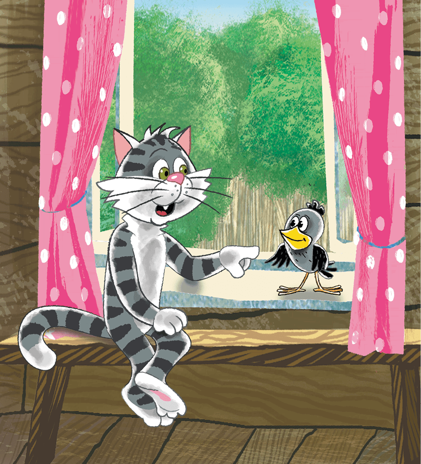 Шарик с котом согласился и тоже стал учить галчонка «ктотаму». Целую неделю учили его, и наконец галчонок выучился. Только кто-нибудь в дверь постучит или на крыльце затопает, Хватайка сразу спрашивает: