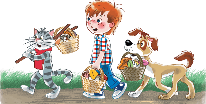 А тут дядя Фёдор идёт из магазина с покупками. Коту он матроску купил, а Шарику – ошейник с медалями.