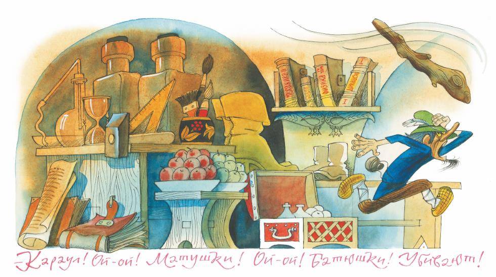 Чумичка всё поднимал, трогал и рассматривал. И вещи вели себя спокойно. Но едва он открыл сундучок, как оттуда выскочила увесистая дубинка и стала колотить писаря по бокам.