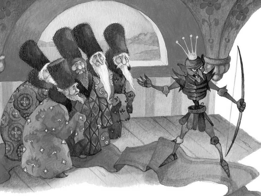 – Тихо, бояре! – неожиданно раздался властный голос. И в зал, гремя доспехами, вступил Кощей Бессмертный. Его зелёные глаза полыхали. – Слушайте меня внимательно, и я вам открою всю правду! – начал он. – Ваш царь уехал в деревню! Отдыхать. Собирать цветочки и ягодки. А перед отъездом он долго просил меня занять его место. И я согласился. Я ваш новый царь! Посмотрите на меня, бояре! Во всём вашем царстве не найдётся воина, равного мне! Я самый сильный! Я самый смелый! Я самый бессмертный из вас! Я научу вас скакать верхом! Плавать! Рубиться на мечах! И вы будете стрелять из лука точно так же, как и я! А ну, подать мне сюда лук и стрелы!