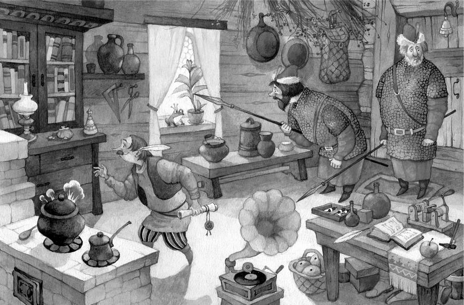 Но дядюшка Домовой и не думал открывать. Он схватил с лавки новую шапку-невидимку, надел её и пропал. Как раз вовремя! Дверь распахнулась, и в мастерскую ввалились дюжие стрельцы.
