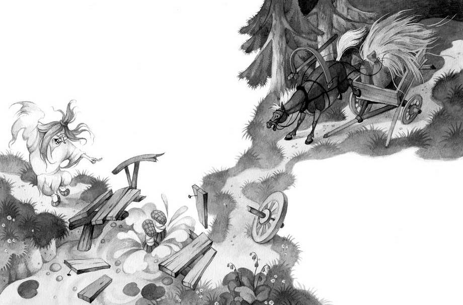 – Ну, я тебе покажу! – рассвирепел мужик. И, размахивая кнутом, он пустился бежать за Лихом. А оно, подобрав полы платья, помчалось во всю прыть. Вот Лихо перескочило через маленький деревянный мостик над рекой, и он сразу развалился. Бедный мужик прямо с берега бултыхнулся в речку.
