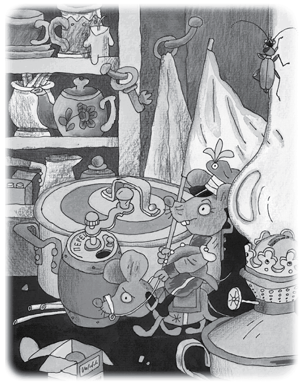 Мастера последний раз оглядели комнату и спустились на пол, где ждала их мышиная кавалерия, привязанная к ножке стола. Верхом на мышах они вернулись в холодильник.