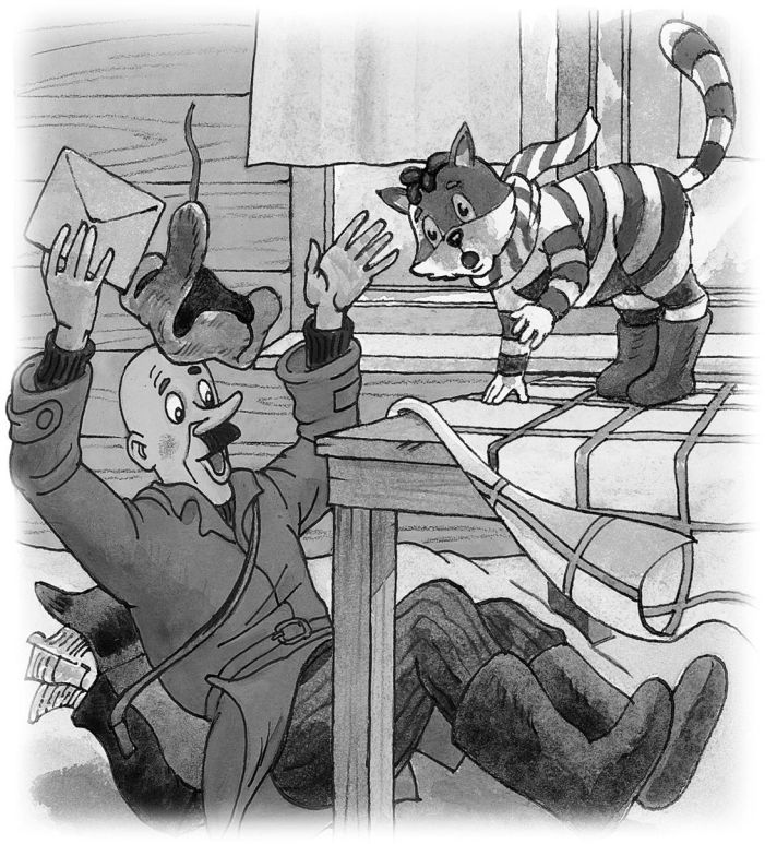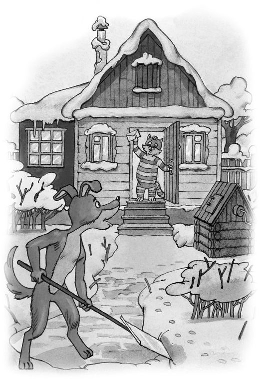 Шарик рассвирепел и давай почтальона кусать за валенки. Еле-еле Печкин за дверь выскочил.