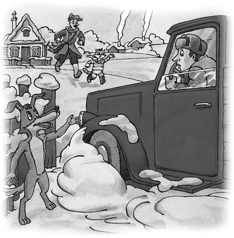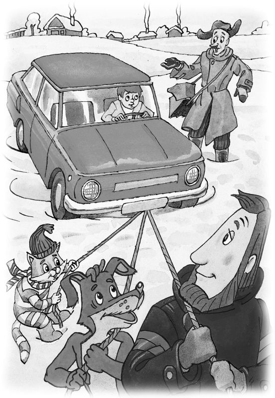 Простоквашинцы сразу обрадовались и дружно побежали машину вытаскивать. Ветер воет, снегом и дорогу, и простоквашинцев забрасывает, но они смело тянут машину сквозь темноту и колючую пургу. Просто как бурлаки на Волге.