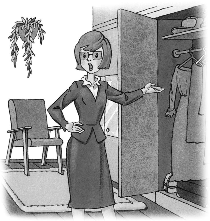 И тут в дверь постучали. И как раз входит человек в маске и с искусственной ёлкой в руках: