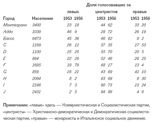 Не менее удивительным представляется непостоянство избирателей. В избирательном округе, к которому относится Монтеграно, одиннадцать коммун. Какие-то победнее, какие-то побогаче, где-то земля находится в руках большего числа собственников, где-то – меньшего. Глядя со стороны, разница между ними не принципиальна – главное, что все они чрезвычайно бедны и изолированы от внешнего мира. При этом электоральное поведение жителей сильно различается от города к городу. Как видно из приведенной ниже таблицы, в 1953 году коммунисты получили в них от 2 до 46 процентов голосов, а на выборах 1956 года – от 2 до 79 процентов.