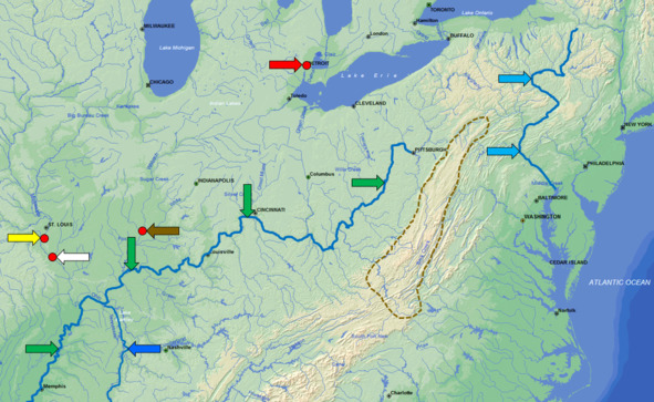 Селение Каскаския (желтая стрелка), селение Кахокия (белая стрелка), река Огайо (зеленые стрелки), река Теннесси (синяя стрелка), река Саскуэханна (голубые стрелки), горы Аллегейни (обведены коричневой пунктирной линией). Винсеннес (коричневая стрелка), Детройт (красная стрелка)