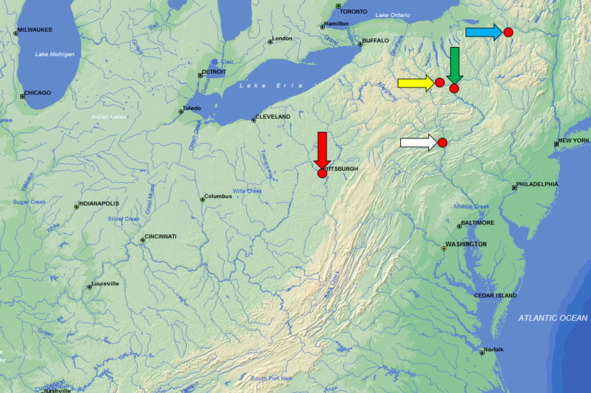 Озеро Отсего (голубая стрелка), форт Салливан (зеленая стрелка), Юнион (белая стрелка), Питтсбург (красная стрелка), Элмира (желтая стрелка)