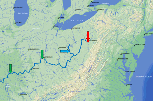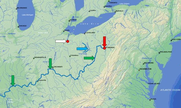 Река Тускаравас (голубая стрелка), река Огайо (зеленые стрелки), форт Питт или Питтсбург (красная стрелка), Верхний Сандаски (белая стрелка)