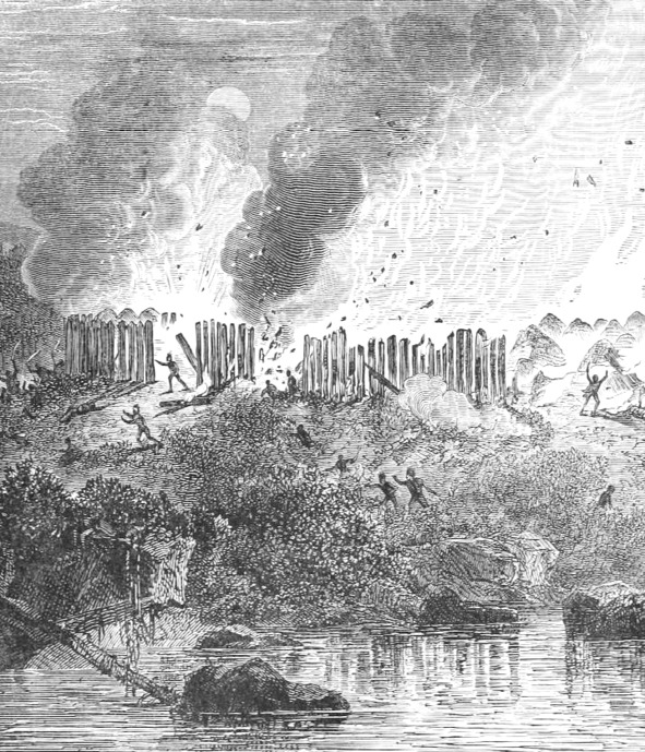 В тот момент, когда возникла угроза поражения, Мейсон схватил горящую головню и бросил ее на соломенную крышу ближайшей хижины, которая сразу же вспыхнула. Андерхилл через минуту сделал то же самое на своей стороне укрепления.