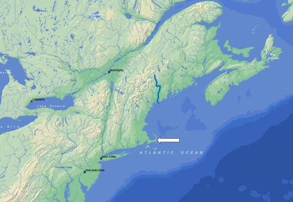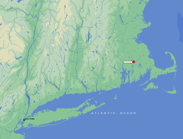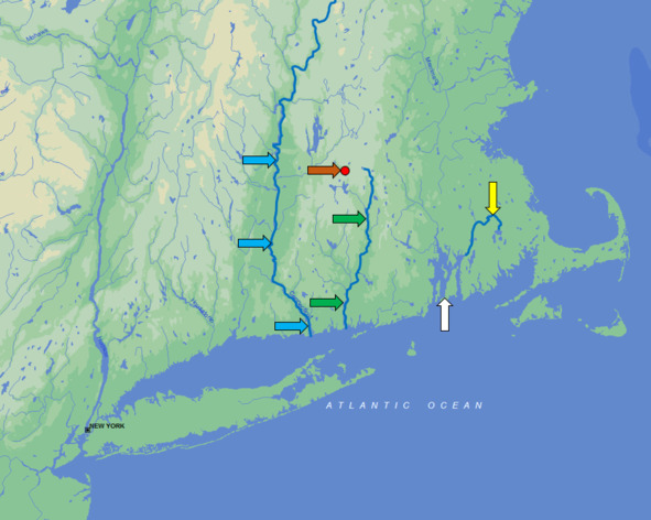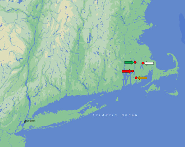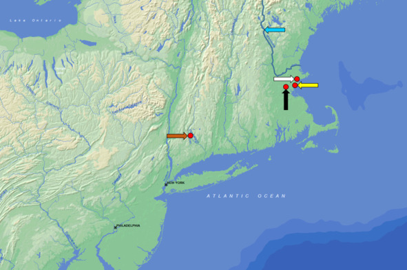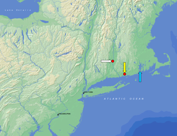 Река Тонтон (желтая стрелка), залив Нарагансетт (белая стрелка), река Коннектикут (голубые стрелки), река Темза (зеленые стрелки), Брукфилд (коричневая стрелка)