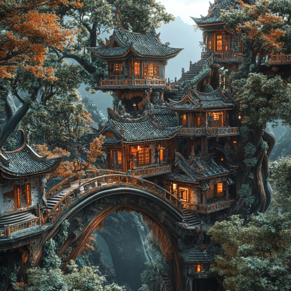 Жилыми домами здесь были укромные домики, построенные прямо на могучих деревьях и соединенные между собой арочным мостами.
