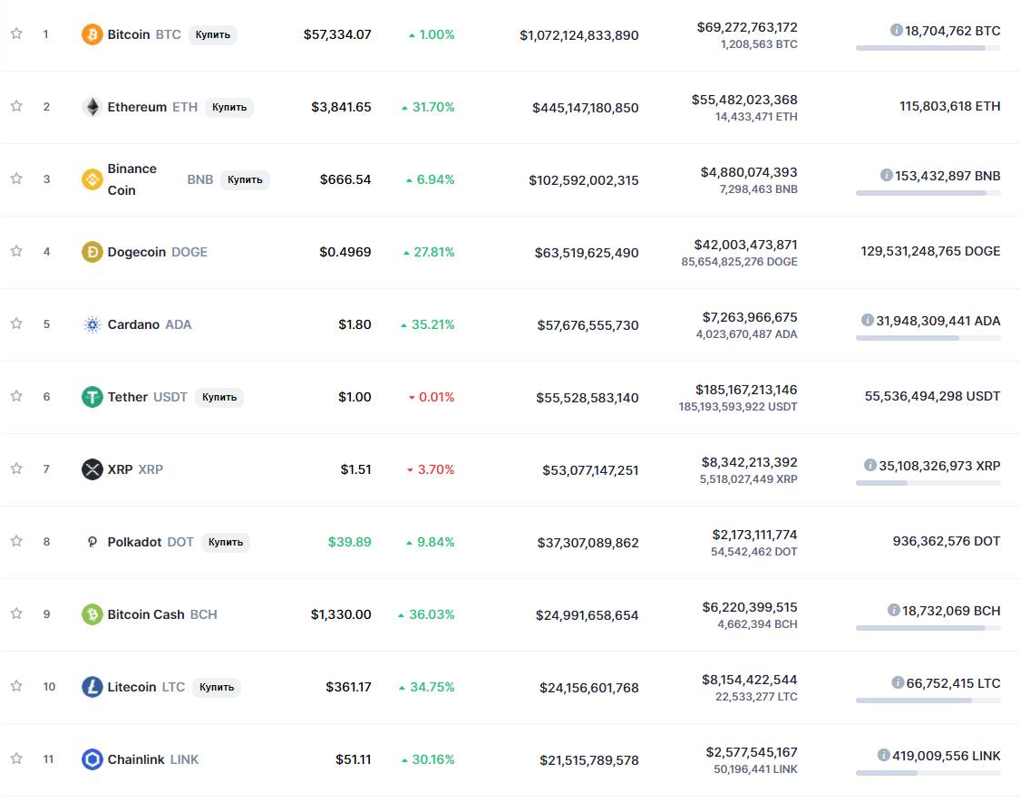 Да, и еще, думаю не стоит объяснять, почему выбрано ранжирование монет по размеру их капитализации. Лично для меня это показатель доверия покупателей к той или иной монете. Давайте приступим, вот этот список на 9 мая 2021 года по данным сайта coinmarketcap.com: