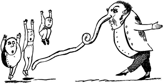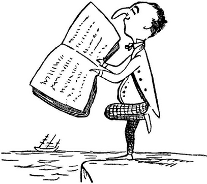 Я следовал из Лондона в Гилдфорд по железной дороге, и в вагоне, кроме меня, был один пассажир, пожилой джентльмен; вскоре, однако, вошли две дамы, сопровождаемые двумя маленькими мальчиками. Эти последние, вертевшие в руках только что полученный ими экземпляр «Книги Нонсенса», бурно выражали свой восторг и постепенно заразили весельем и всю компанию.