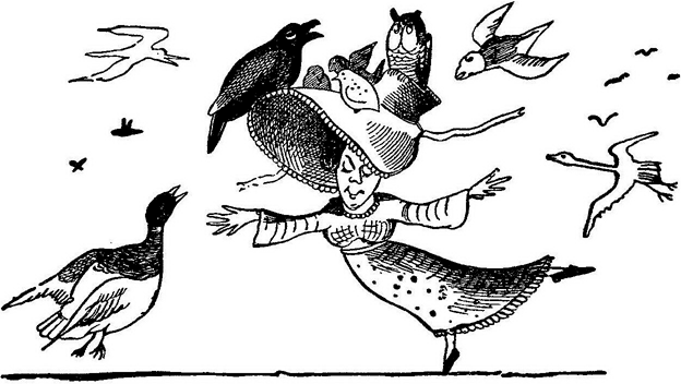 There was a Young Lady whose bonnetCame untied when the birds sate upon it;But she said, 'I don't care!All the birds in the airAre welcome to sit on my bonnet!У девицы все ленты на шляпкеРастрепали пернатые лапки;Но она не гневицца:«Ведь сама этих птиц яПосидеть приглашала на шляпке!»