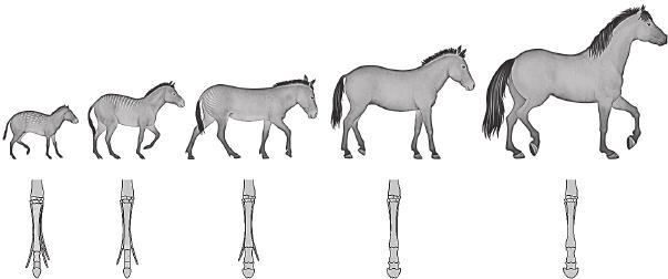 Множество доказательств эволюции дает палеонтология, наука, изучающая организмы, существовавшие в прошлые геологические периоды. Окаменевшие остатки и отпечатки древних организмов дают нам возможность сравнивать потомков, то есть – ныне существующие виды, с предками и отслеживать изменения, произошедшие в результате эволюции. Так, например, установлено, что современные однопалые травоядные лошади происходят от более мелких пятипалых всеядных предков, населявших нашу планету примерно 70 000 000 лет назад. Эти пралошади обитали в лесах, но глобальное изменение климата, приведшее к сокращению площади лесов на планете и увеличению площади степей, вынудило их начать осваивать новую среду обитания. В степи спастись от хищников можно только бегством, в отличие от леса, прятаться там негде. Необходимость быстрого бега привела к преобразованию конечностей – они удлинились, а число пальцев уменьшилось до одного. Длинные и быстрые ноги пригодились не только для защиты, но и для добывания пищи, ведь в поисках пастбищ лошадям регулярно приходилось преодолевать большие расстояния. Пастбищ, обратите внимание! В степи лошадям пришлось перейти от смешанного питания к вегетарианскому, потому что животной пищи в степи гораздо меньше, чем растительной, и добывать ее весьма сложно. Растительную пищу нужно тщательно перетирать и долго переваривать. В результате зубы увеличились в размерах, их строение стало более сложным, увеличился желудок, удлинился кишечник.