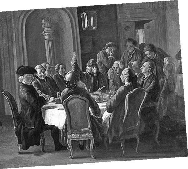Беседовали о том, о чем тогда говорили повсюду – от последней лакейской до герцогских дворцов: о Вольтере, Дидро, Руссо, Монтескье. Все эти великие имена были тогда так же популярны, как сейчас имена известных футболистов. Издевались над ничтожным королем. Потом перешли к религии. Веселились. Цитировали «Девственницу» «бога неверия» Вольтера (как его тогда почтительно называли), вспоминали строчку Дидро «Кишкой последнего попа последнего царя удавим». Говорили о том, что после революции наступит Царство Разума, когда религия – тысячелетний пережиток – конечно же, исчезнет. Далее беседа зашла о неминуемой Революции. Радовались, что она свершится непременно, но и сокрушались – люди собрались заслуженные и немолодые. Их печалило, что великое Царство Разума, рожденное Революцией, им, увы, не увидеть…