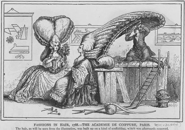Это были гигантские, часто тематические сооружения. Например, герцогиня Орлеанская родила. Она решает оповестить всех о своей радости. И знаменитый парикмахер воздвигает на ее голове прическу, которую украшют фигурки – кормилица с младенцем, любимый слуга-эфиоп и сама роженица!