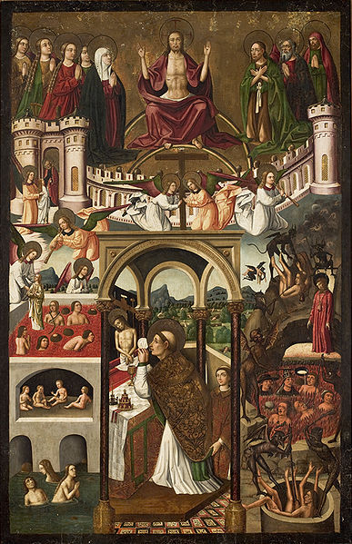 The Church created the indulgence as a hedge against too long a stay in Purgatory (pictured below). Indulgences, of which there were many forms, basically shortened the time of punishment in Purgatory for one’s sins. Prominent among these forms was the purchase of pardon. These purchases were recognized as abusive by the Church itself, but the abuse continued nonetheless. Christians could, depending on how much money they paid for these indulgences, shorten their own souls’ or the souls of their relatives’ duration in Purgatory and hasten entry into Heaven by a year, ten years, several hundred or however much they could afford. However, if the uncertain Christian had not paid enough, the poor soul still might have another several million years to spend in Purgatory; or, conversely, he may have overpaid. Proceeds from the purchase of indulgences were used for rebuilding the ancient St Peter’s in Rome to be the present basilica we know it as today. It was a win-win solution for the Church and an uncertain one for the buyer of the indulgences.