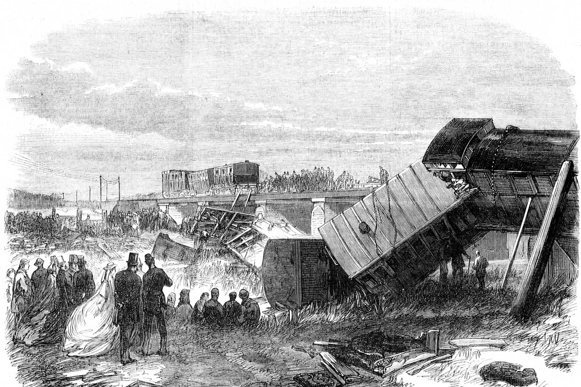 On 9 June 1865, returning from France through Kent en route to Charing Cross, the train he was travelling in came to a low viaduct at Staplehurst that was in the process of being repaired. Several carriages plunged off the tracks, killing ten people and injuring fifty, although the structure stood only around ten feet above the muddy stream below; at the moment of derailment Dickens was reading through the manuscript of Our Mutual Friend. As the writer and his mistress, the actress Ellen Ternan, were at the front of the vehicle in first class, they got off relatively lightly. However, Ternan suffered physical injuries that incapacitated her for weeks, while Dickens, who helped to comfort other passengers, was traumatised, and nervous of train travel thereafter. And, in an odd twist, his own death (resulting from a stroke) was to coincide with the fifth anniversary of the accident.