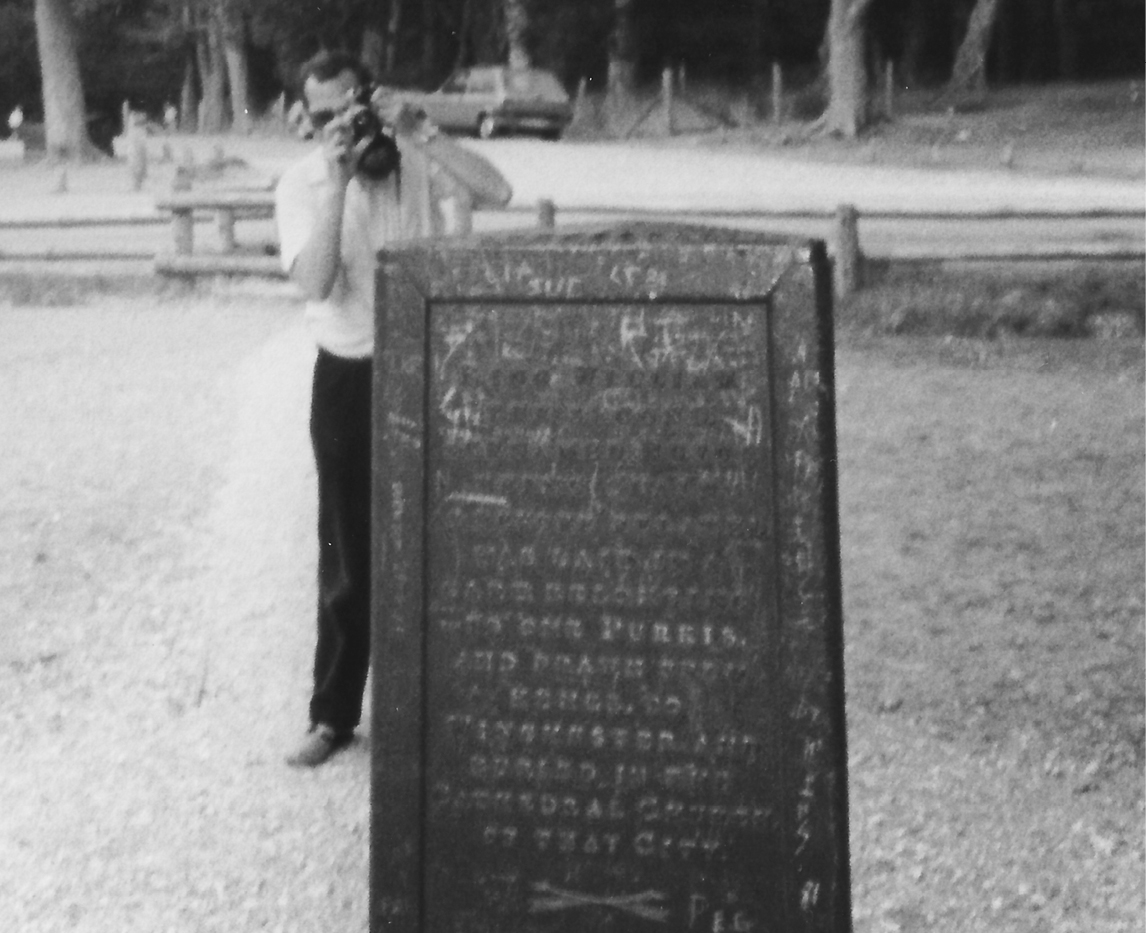 We visited the Rufus Stone, which marks the spot of the regicide, during that same sunburnt summer: the original stone, according to the 1841-erected replacement, was ‘much mutilated, and the inscriptions on each of its three sides defaced’. Among my box of old family photos and slides I can find only a solitary picture of the marker post – an image of my father engaged in the act of capturing the monument on film; the photo possesses a grainy, otherworldly hue that now would have to be digitally fabricated by some Instagram or iPhone filter. In more recent years the unobtrusive turnoff on the A31 has beckoned me to the place every time I’ve passed it on my way to see my brother at his nearby Dorset home.