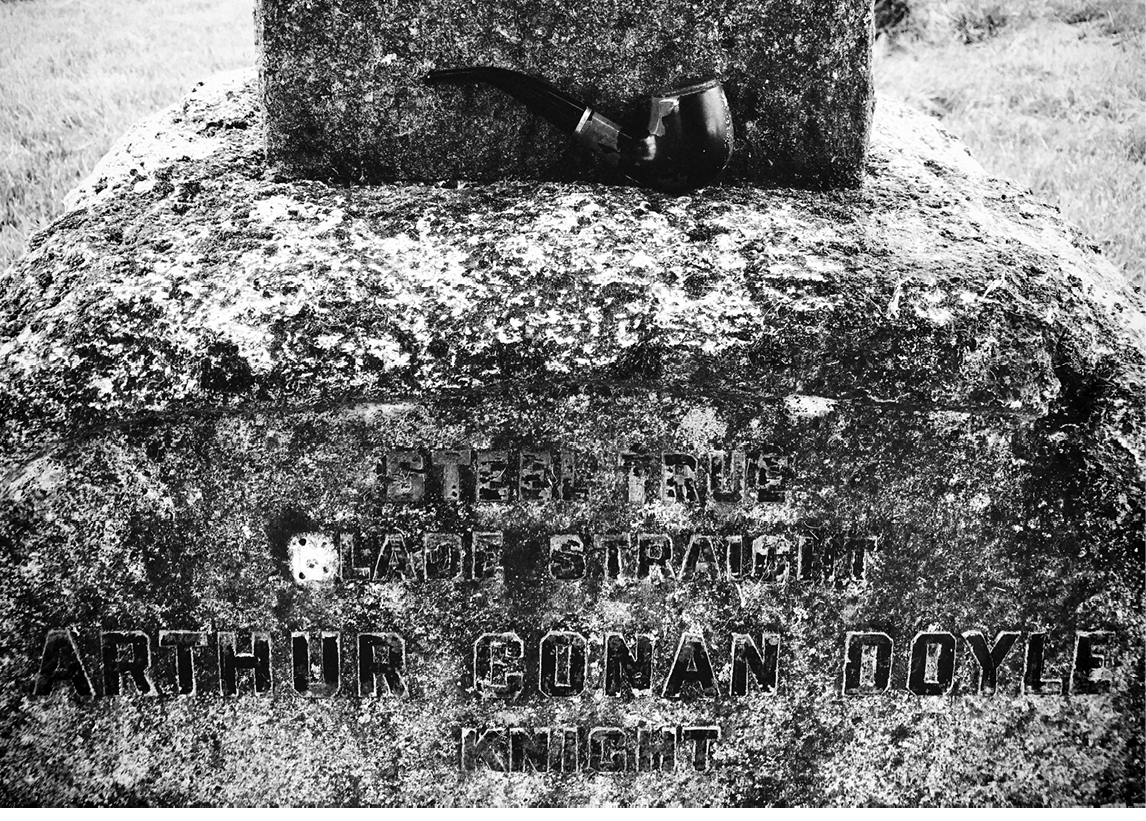 We do, however, have irrefutable proof of at least one last earthly trip Doyle was to make, a quarter of a century after his body had departed this life: a hundred-mile hearse ride. In 1955, after the Windlesham estate had been sold, his remains were exhumed, moved and reinterred, along with those of his spouse, beneath a mature oak in the southern corner of Minstead churchyard, close to their beloved New Forest retreat. It is a pleasant, peaceful final spot of rest; when I visit, ponies are galloping after each other in the adjacent paddock. Someone has placed a bent smoking pipe on top of his headstone too, which seems an appropriate touch.