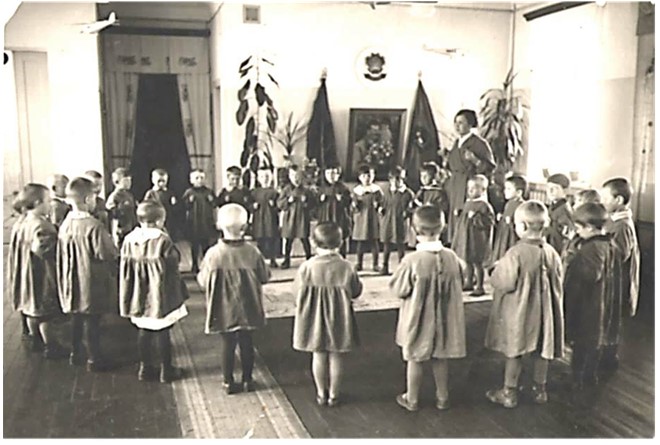 Я – любопытный. Стою у окна и смотрю на фотографа. Остальные дисциплинированно смотрят прямо перед собой. А какое «великолепное» одеяние-форма у дошкольников – просто тюремные робы, называемые халатами. Вот так с детства нас приучали к коллективизму и униформе.